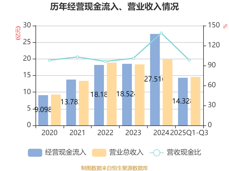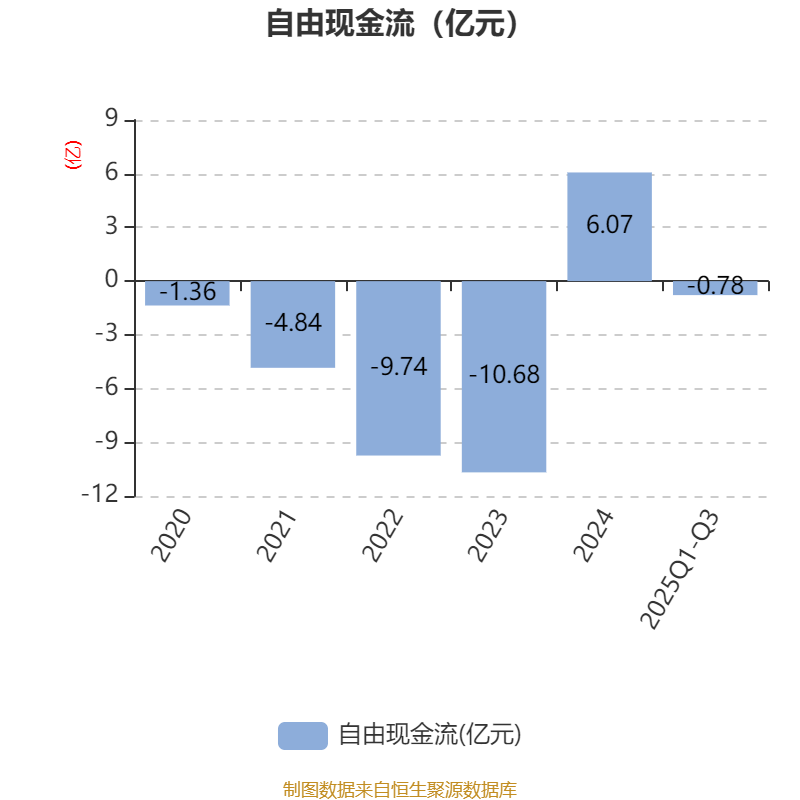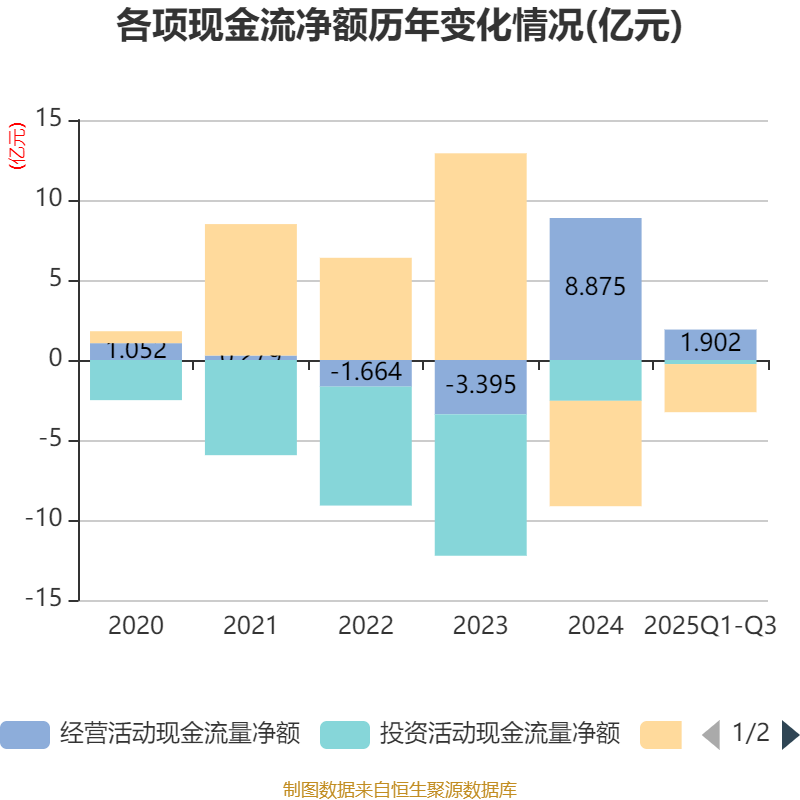 2025年前三季度,公司经营活动现金流净额为1.9亿元,同比下降72.19%;筹资活动现金流净额-3.01亿元,同比增加1.64亿元;投资活动现金流净额-2539.58万元,上年同期为-2.54亿元。