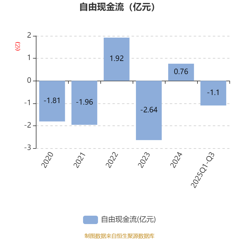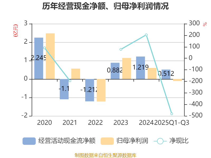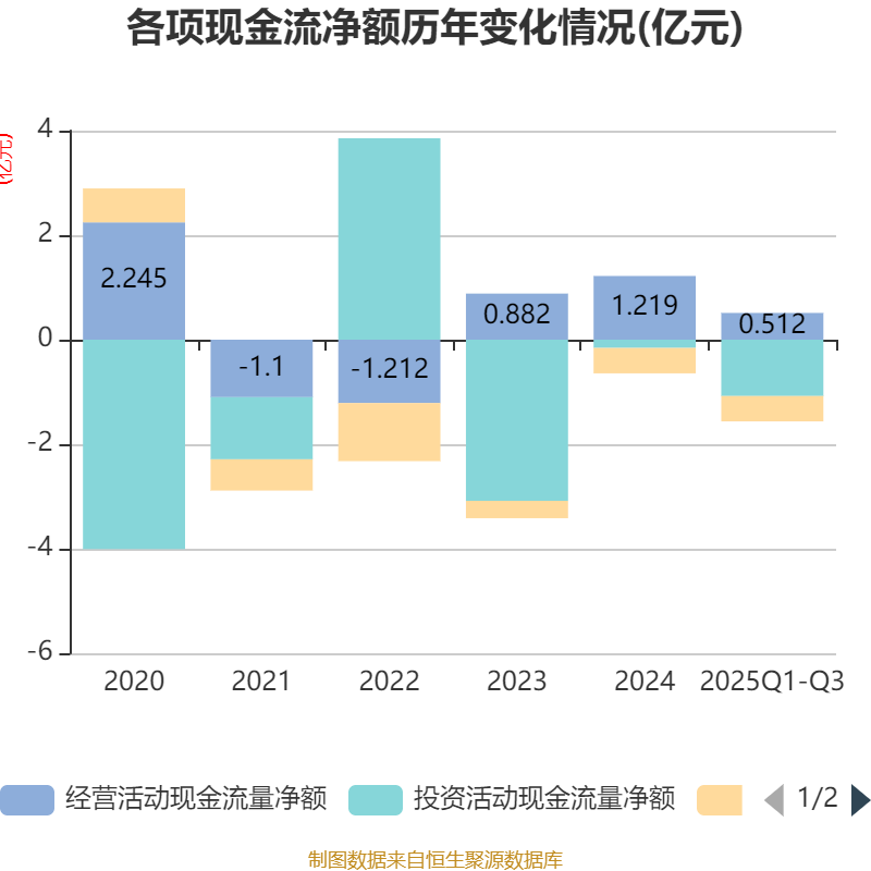 2025年前三季度,公司经营活动现金流净额为5119.12万元,同比下降34.6%;筹资活动现金流净额-4850.13万元,同比减少231.84万元;投资活动现金流净额-1.08亿元,上年同期为-4633.96万元。