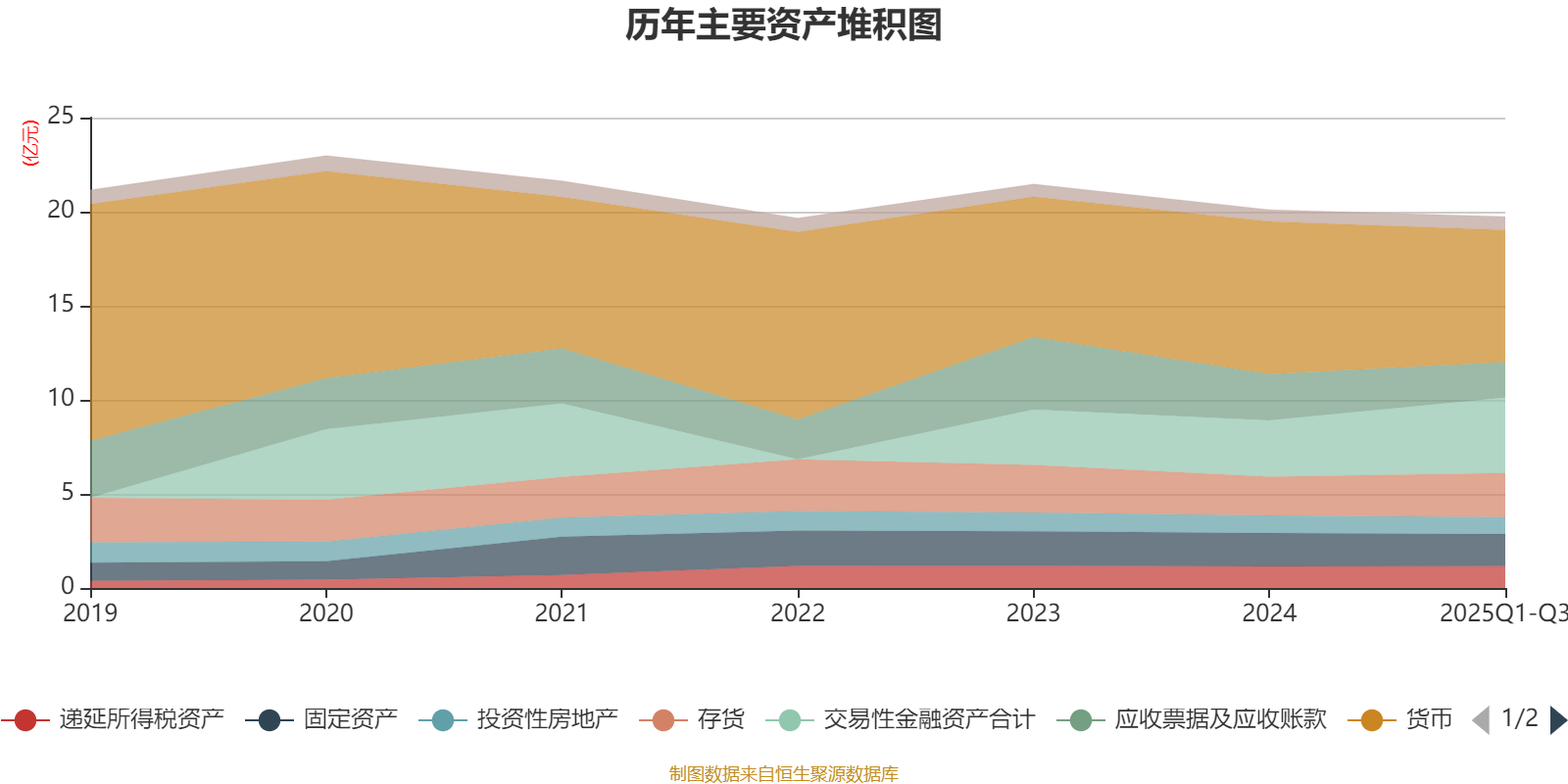 资产重大变化方面,截至2025年三季度末,公司交易性金融资产合计较上年末增加33.33%,占公司总资产比重上升5.34个百分点;货币资金较上年末减少13.55%,占公司总资产比重下降4.82个百分点;应收票据及应收账款较上年末减少22.61%,占公司总资产比重下降2.58个百分点;存货较上年末增加14.07%,占公司总资产比重上升1.65个百分点。
