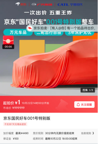10月17日,京东官宣双11期间联合广汽、宁德时代推出的神秘“国民好车”001号已正式上线京东App,并在“京东拍卖”频道开启预订,起拍价仅为1元,首位车主也将通过竞拍产生。