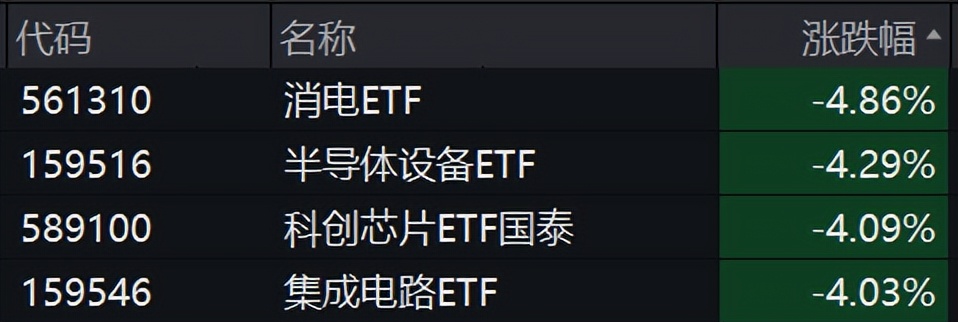 市场全天震荡调整,截至收盘,沪指跌1.95%,深成指跌3.04%,创业板指跌3.36%。今日半导体板块回调,半导体设备ETF收跌4.29%,科创芯片ETF收跌4.09%,集成电路ETF收跌4.03%。消电ETF伴随算力回调,收跌4.86%。