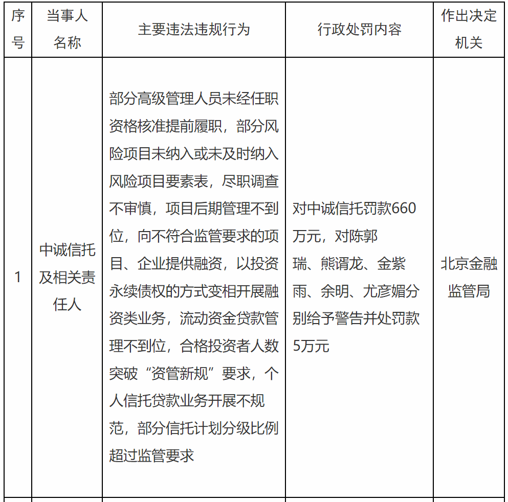 中诚信托的违法违规行为包括:部分高级管理人员未经任职资格核准提前履职,部分风险项目未纳入或未及时纳入风险项目要素表,尽职调查不审慎,项目后期管理不到位,向不符合监管要求的项目、企业提供融资,以投资永续债权的方式变相开展融资类业务,流动资金贷款管理不到位,合格投资者人数突破“资管新规”要求,个人信托贷款业务开展不规范,部分信托计划分级比例超过监管要求。北京金融监管局因此对中诚信托罚款660万元,对相关责任人陈郭瑞、熊谞龙、金紫雨、余明、尤彦媚分别给予警告并处罚款5万元。