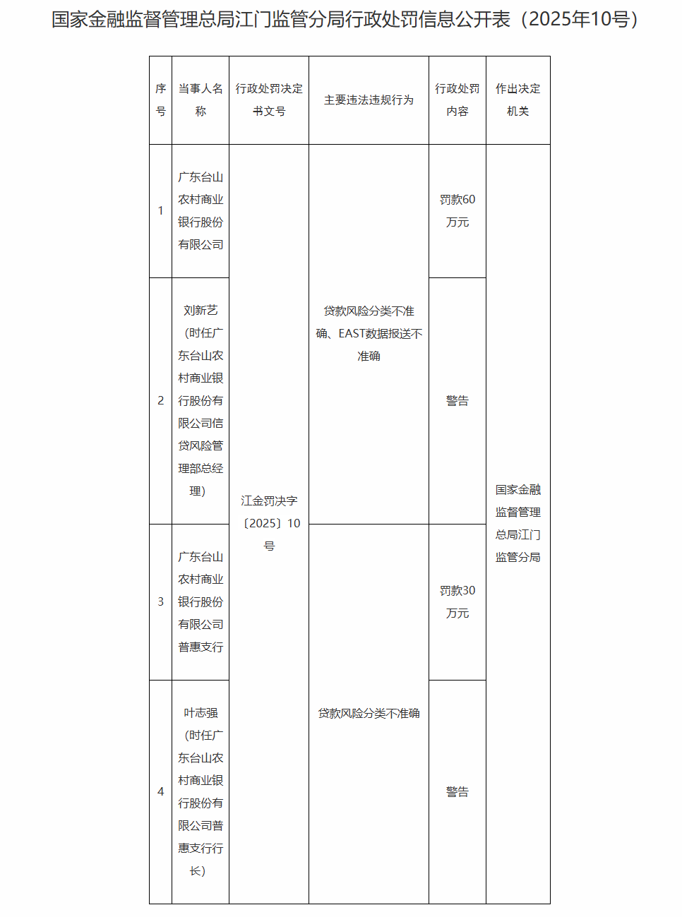 据国家金融监督管理总局江门监管分局发布的行政处罚公开表显示,因贷款风险分类不准确、EAST数据报送不准确,台山农商银行被罚款60万元,相关责任人,时任广东台山农村商业银行股份有限公司信贷风险管理部总经理刘新艺被警告;与此同时,台山农商银行普惠支行也因“贷款风险分类不准确”被罚款30万元,相关责任人,时任广东台山农村商业银行股份有限公司普惠支行行长叶志强被警告。