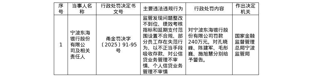 罚单显示,宁波东海银行股份有限公司的主要违法违规行为是:监管发现问题整改不到位、绩效考核指标和延期支付范围设置不合规、部分员工存在失范行为、以不正当手段吸收存款、对公信贷业务管理不审慎、个人信贷业务管理不审慎。