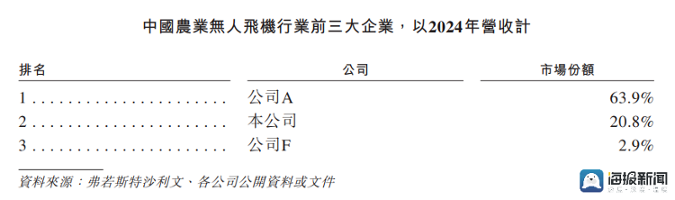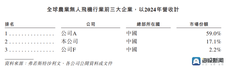 招股书显示,根据弗若斯特沙利文报告,以2024年营收计,极飞科技在全球农业无人飞机行业位于第二,市场份额为17.1%。而以2024年营收计,极飞科技在中国农业无人飞机行业位于第二,市场份额为20.8%。