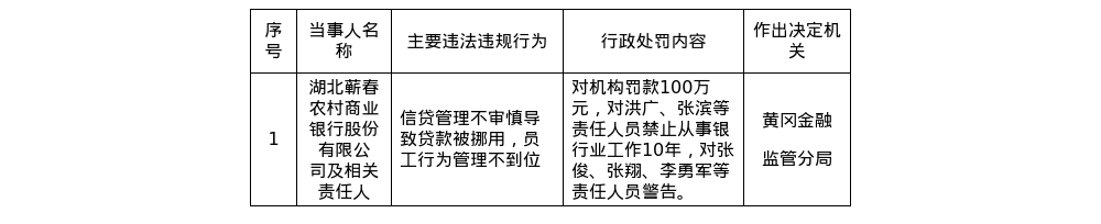 湖北蕲春农商行被罚100万,责任人被禁业或警告