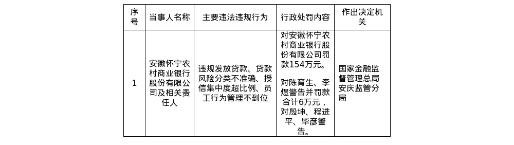 安徽怀宁农商行被罚154万,涉违规发放贷款等