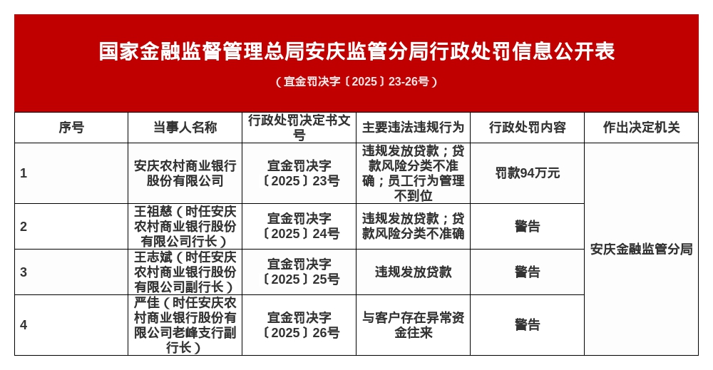 此外,王祖慈时任安庆农村商业银行股份有限公司行长,王志斌时任副行长,严佳时任老峰支行副行长,分别被警告。