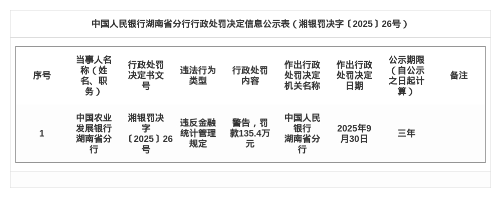 中国农发行湖南省分行被罚135.4万,涉违反金融统计管理规定