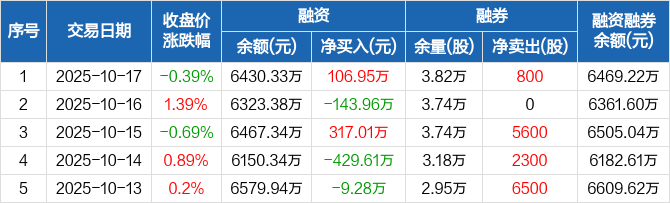 融资方面,当日融资买入404.48万元,融资偿还297.53万元,融资净买入106.95万元。融券方面,融券卖出800股,融券偿还0股,融券余量3.82万股,融券余额38.89万元。融资融券余额合计6469.22万元。