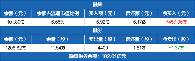 融资方面,当日融资买入6.92亿元,融资偿还6.17亿元,融资净买入7457.96万元。融券方面,融券卖出4400股,融券偿还1.81万股,融券余量11.54万股,融券余额1208.82万元。融资融券余额合计102.01亿元。