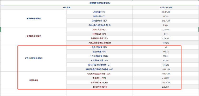 中证数据还显示,截至10月16日,两融市场中的个人投资者数量为771.81万名、机构投资者为50204家,参与交易的投资者数量为438313名,平均维持担保比例为279.01%。