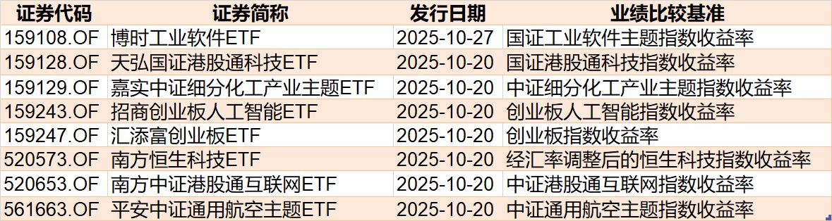 目前有8只ETF披露下周发行,跟踪标的有通用航空、港股通互联网、恒生科技、创业板指、创业板人工智能、化工、工业软件等。