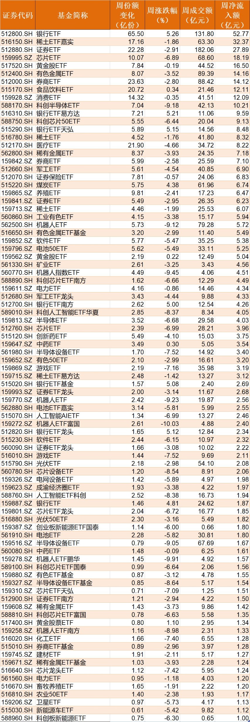 值得注意的是,本周银行板块再度获得资金关注,银行ETF(512800)份额增加了65.5亿份,升至253.29亿份,创上市新高。