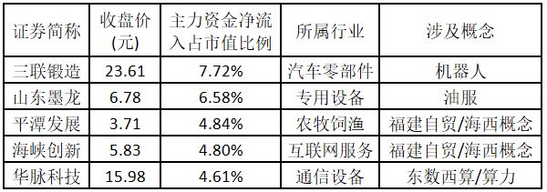 主力资金净流入金额占市值比例排名前5的个股分别为三联锻造、山东墨龙、平潭发展、海峡创新、华脉科技。