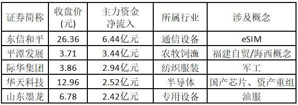 从主力资金来看,周五的涨停板个股中,主力资金净流入金额排名前5的个股分别为东信和平、平潭发展、际华集团、华天科技、山东墨龙。