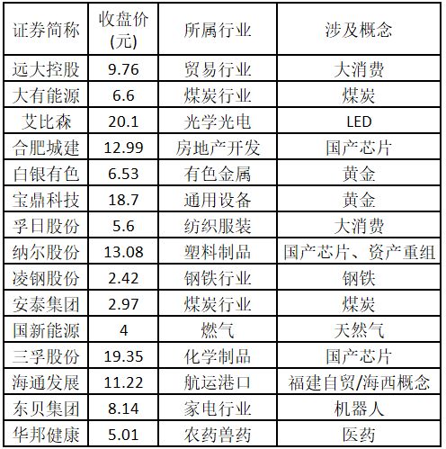 涨停板个股中,股价创出近一年新高的个股有15只(不包括创出历史新高的个股),包括远大控股、大有能源、艾比森、合肥城建、白银有色、宝鼎科技、孚日股份、纳尔股份、凌钢股份、安泰集团、国新能源、三孚股份、海通发展、东贝集团、华邦健康,具体如下表所示。