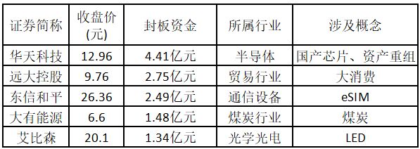 从封板资金来看,周五的涨停板个股中,封板资金排名前5的个股包括华天科技、远大控股、东信和平、大有能源、艾比森。