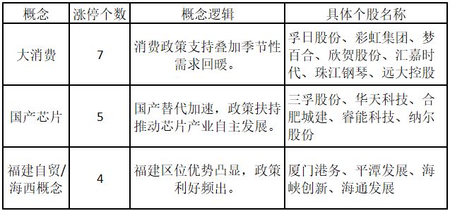 从概念特征来看,周五的涨停板个股中,大消费、国产芯片、福建自贸/海西概念的个股最多。