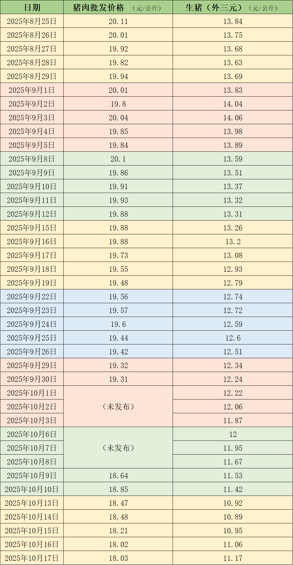 近期的猪肉和生猪价格。制表澎湃新闻