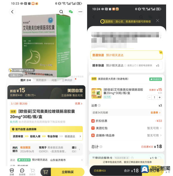 而在实际购买中,记者也发现,虽然线上平台购药价格普遍低于线下价格,但线上渠道因平台优惠券、折扣力度、运费设置等原因,平台更倾向于推荐消费者多量购买,比如,在美团自营大药房购买艾司奥美拉唑镁肠溶胶囊,原价48元,平台优惠后页面显示每盒15元,实际支付需要3元运费,最终支付价为每盒18元。但如果一次性购买4盒,则免运费。