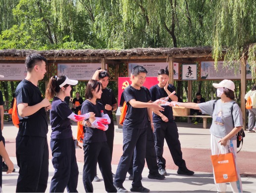 起跑前,全体党员在荷韵清风广场党建文化长廊的党旗前重温入党誓词,兴庆分局经侦大队大队长吴枭杰领誓,80字的誓词,现场80余名警官和证券行业党员代表以庄重的姿态、昂扬的气势接力诵读,铿锵有力,声若洪钟。从 “初心如磐终不改” 的坚守,到 “甘将热血沃中华” 的使命诠释,大家在一字一句的感悟中,传承共产党人的红色基因,汲取奋进新征程的精神力量。随后,党员选手们佩戴党徽,分散融入队伍,边跑边与身边的群众交流非法荐股、非法集资、电信诈骗等现象和问题,真正实现“党员在身边、课堂在移动”。一位有着21年党龄的社区民警跑完感慨:“把党课从会议室搬到跑道,是第一次,也是记忆最深的一次。”