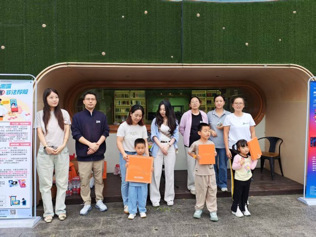 早上9点许,所有参赛者在中江书苑大门口集合签到,工作人员为他们发放防晒护臂、饮用矿泉水等跑步用品,同时发放脸贴、徽章、防非手摇扇、拼图等防非宣传物品。为了方便家长们的参与,工作人员特别安排已报名的家长下载数字心动app,使用报名时填写的手机号登录,即可线上同步参赛,完赛可获得专属的电子成绩证书。