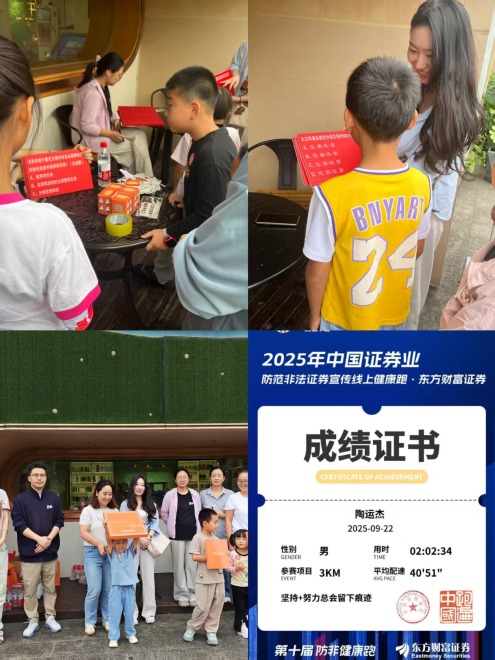 为响应中国证券业协会关于“跑遍中国.2025年中国证券业防范非法证券宣传线上健康跑.东方财富证券”活动号召,2025年9月21日上午,东方财富证券2025年中国证券业防范非法证券宣传健康跑芜湖站成功举办。本次活动联合芜湖中江书苑,以“非常警惕,健行未来”为主题,共邀请家庭30组,家长30名,共计60人,通过防非健康跑活动,构筑面向社区居民及青少年儿童的防非宣传阵地,创新防非宣传的方式方法,呵护祖国的花朵健康成长,活动通过线上与线下同步进行的方式开展。