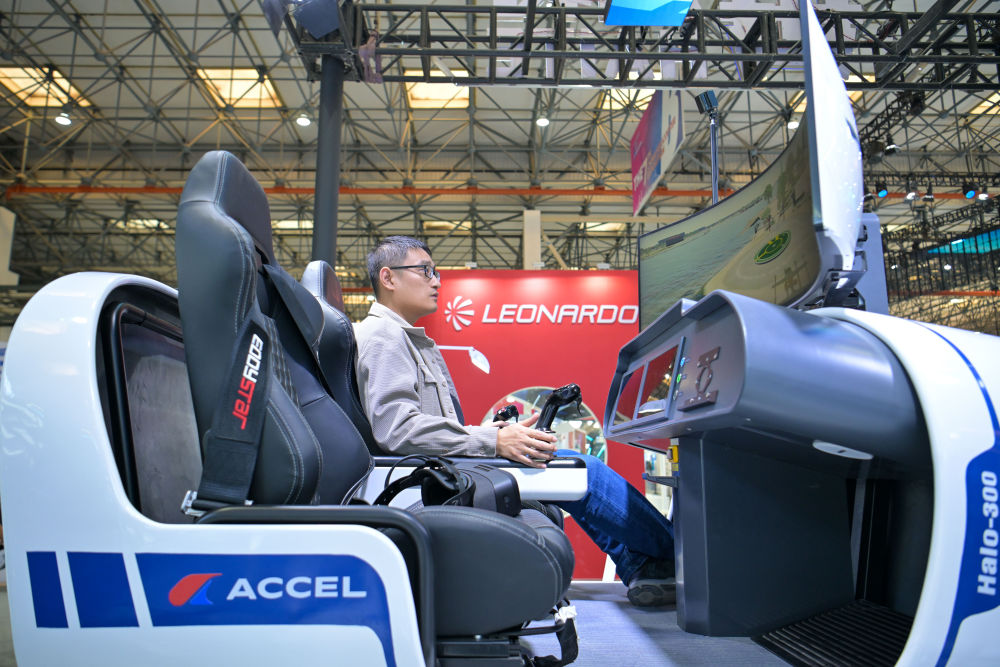 10月16日,观众在天津直博会低空经济馆内体验一款eVTOL(电动垂直起降飞行器)。新华社记者赵子硕摄