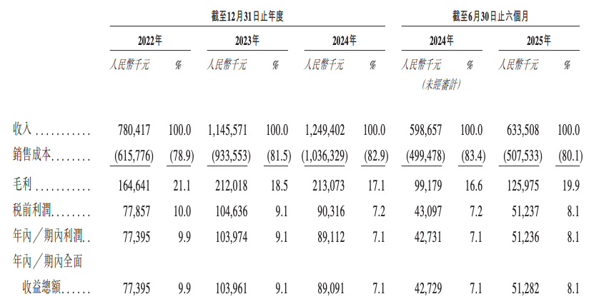 招股书显示,新荷花2022年、2023年、2024年营收分别为7.8亿元、11.46亿元、12.49亿元;毛利分别为1.65亿元、2.12亿元、2.13亿元;毛利率分别为21.1%、18.5%、17.1%。对应的年内利润分别为7740万元、1.04亿元、8911万元;年内利润率分别为9.9%、9.1%、7.1%。