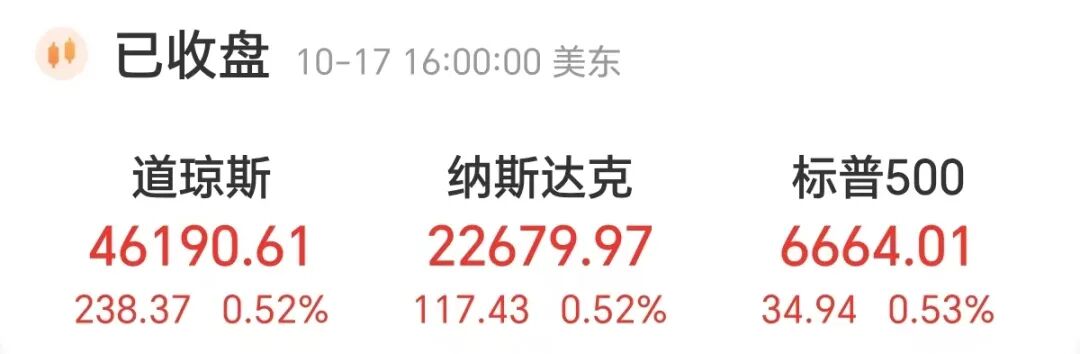 当地时间周五(10月17日)美股三大指数收盘全线上涨。截至收盘,道琼斯工业平均指数比前一交易日上涨238.37点,收于46190.61点,涨幅为0.52%;标准普尔500种股票指数上涨34.94点,收于6664.01点,涨幅为0.53%;纳斯达克综合指数上涨117.43点,收于22679.97点,涨幅为0.52%。