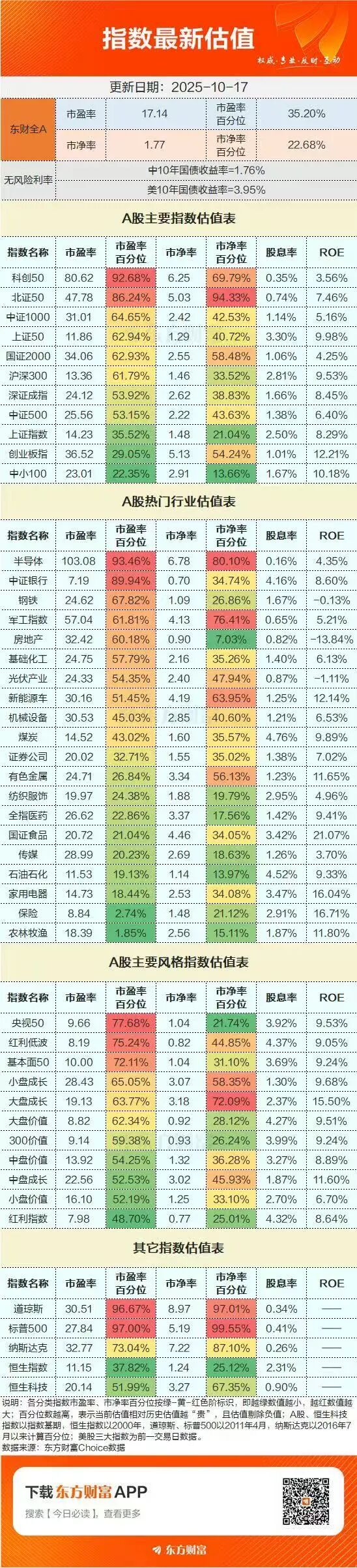 截至10月17日收盘,东方财富Choice数据显示,东财全A市盈率为17.14倍,市盈率百分位为35.2%;市净率为1.77倍,市净率百分位为22.68%。