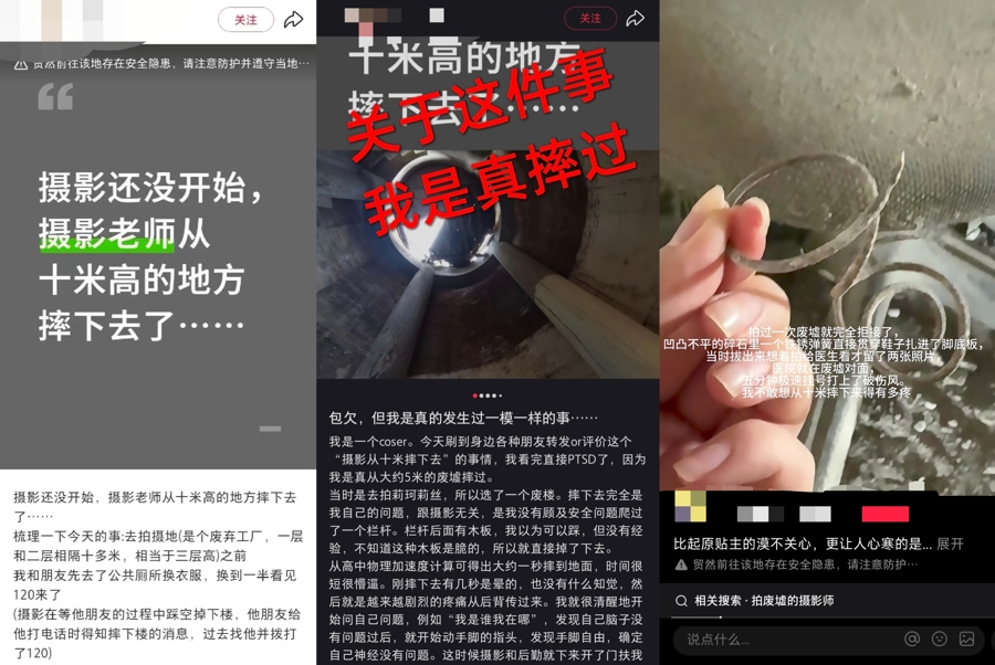 在追求视觉冲击力的“废墟约拍”中,这种风险被放大至极。摄影师与模特为获取独特角度,常常选择冒险攀爬至危险机位。今年8月,大连一位摄影师约拍过程中,为寻找更符合角色氛围的场景,冒险进入一处张贴有明显警示标识的废弃广场内,导致从十米高处坠落重伤。