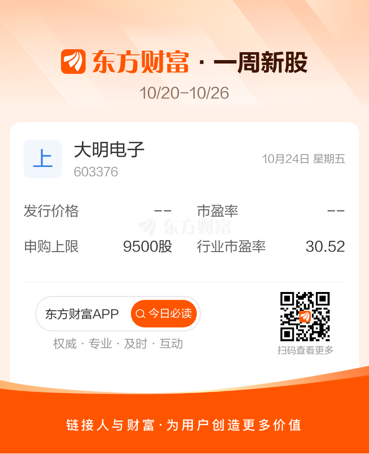 下周(10月20日至10月26日)沪深北三市有1只新股申购,为大明电子。