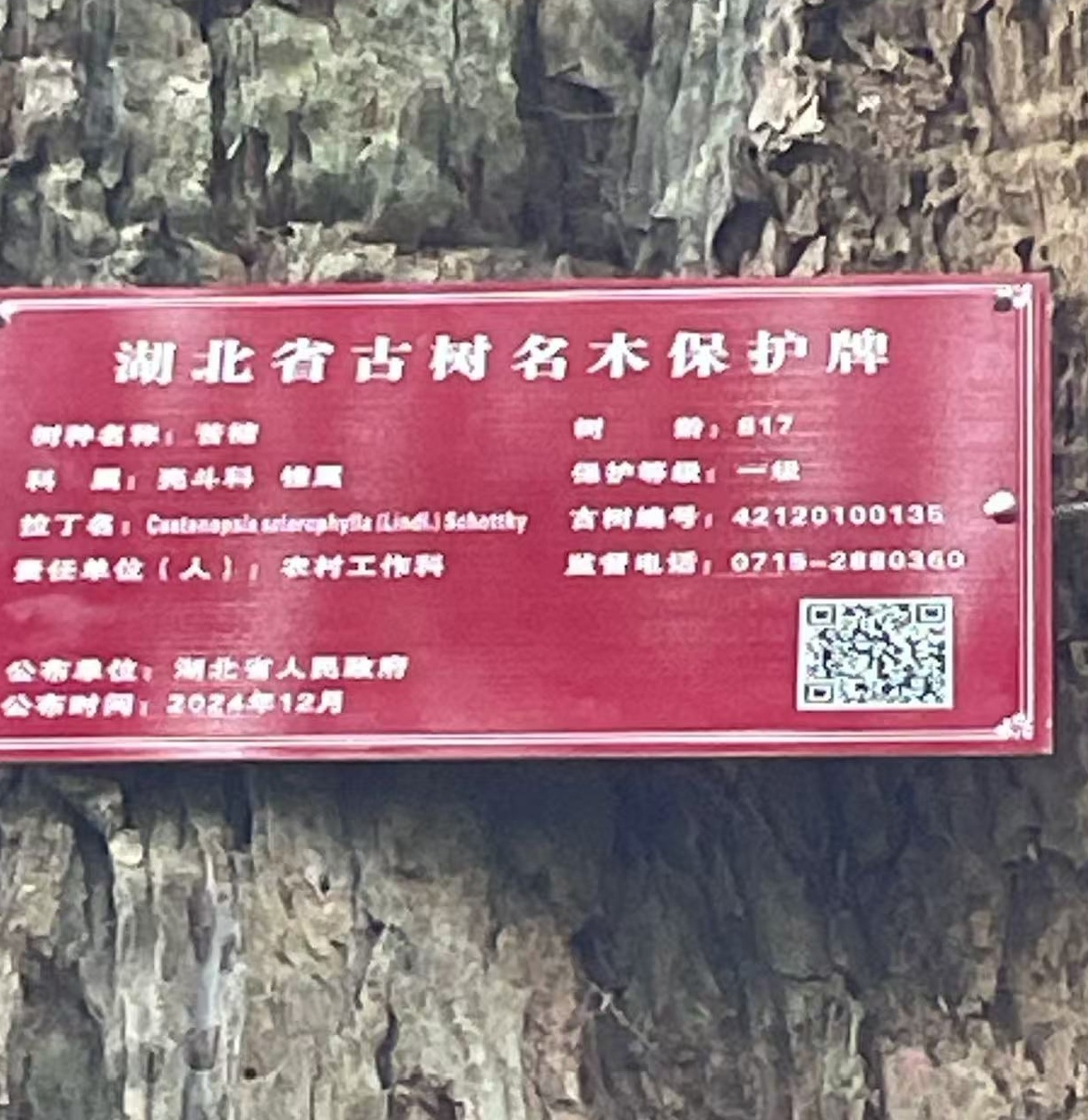 新保护牌兼具实用性与科普性:正面清晰标注古树的树龄、树种、科目等核心信息,就连胸围等关键数据也精准呈现,如一株一级古树的810年树龄一目了然;背面创新性融入九宫山保护区专属二维码,游客扫码即可实时查阅古树的生长历程、生态价值,以及背后承载的地方人文故事,让原本“沉默”的古树成为公众亲近自然、了解生态的直观窗口。