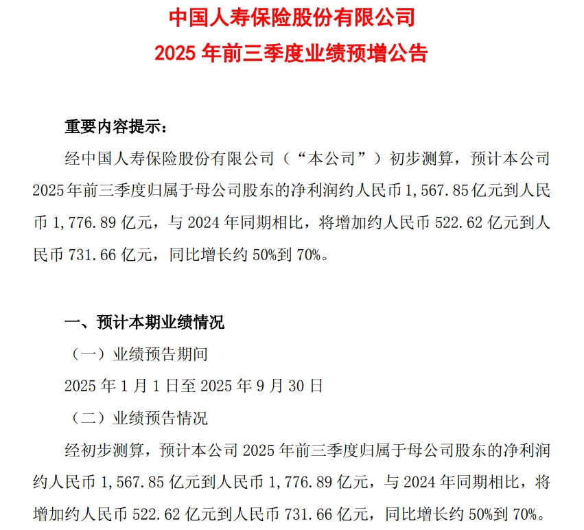 中国人寿发布业绩预增公告,前三季度净利约1570.11亿~1779.46亿元,预计增长五成到七成