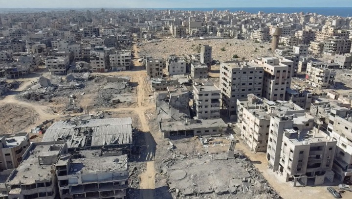 这是10月18日拍摄的加沙城的建筑物废墟(无人机照片)。 新华社发