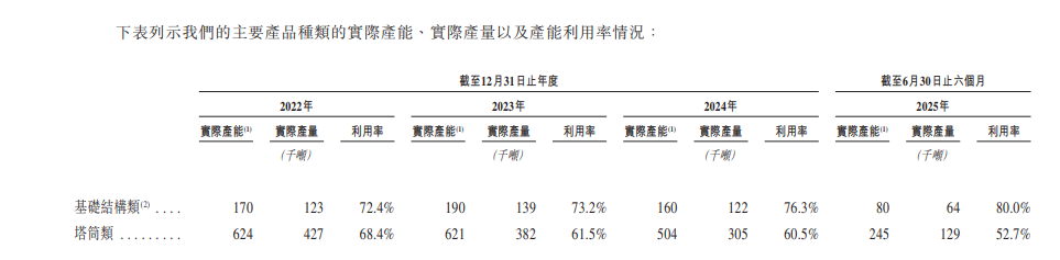 大金重工招股书显示了公司产能利用率情况。2024年末,公司风电基础结构类产品实际产能16万吨,产能利用率76.3%;塔筒类50.4万吨,利用率60.5%。2025年上半年,产能利用率分别为80%和52.7%。