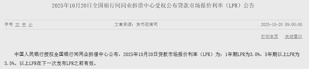 中国人民银行授权全国银行间同业拆借中心公布,2025年10月20日贷款市场报价利率(LPR)为:1年期LPR为3.0%,5年期以上LPR为3.5%,连续5个月维持不变。以上LPR在下一次发布LPR之前有效。