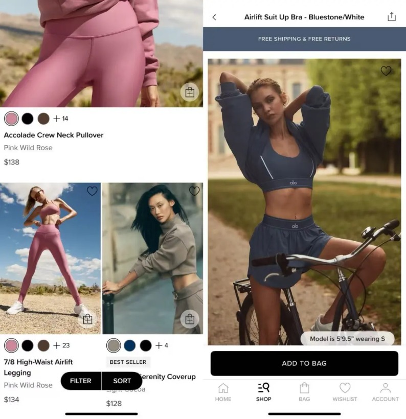不过仔细对比就会发现,Lululemon更注重性能,而Alo则强调美学。后者将产品品类扩展至瑜伽运动之外,并用类似快时尚的模式高频推出新颜色新款式,着力打造时尚单品。