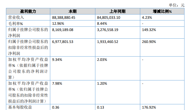2025年上半年,公司实现营业收入8838.89万元,同比增加4.23%;归属于挂牌公司股东的净利润为816.92万元,同比大增149.32%。其中,公司毛利率由去年同期的8.44%上升至12.96%。