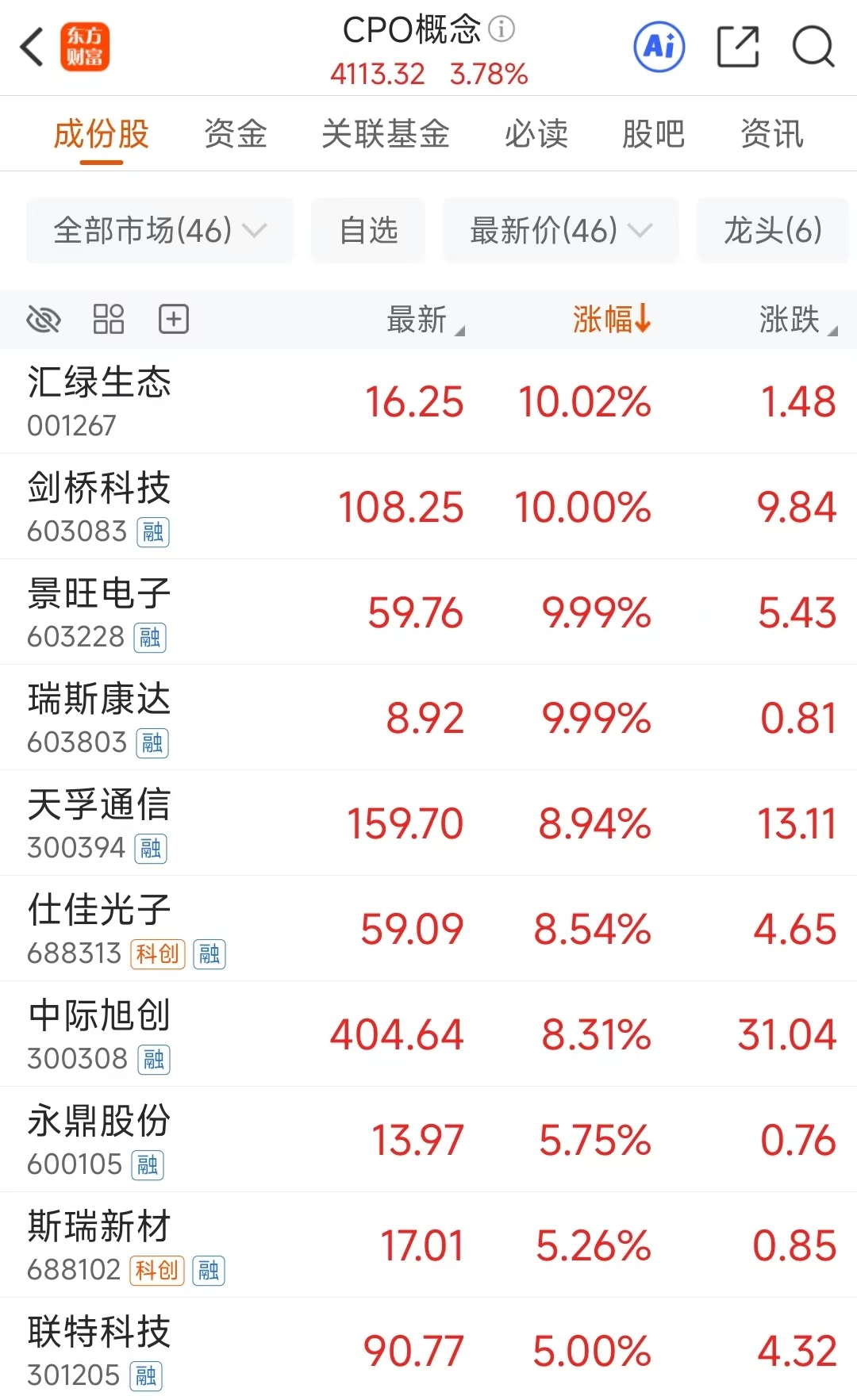 CPO概念在10月20日早盘表现强势,早盘收盘指数涨3.78%。板块中汇绿生态、剑桥科技、景旺电子、瑞斯康达纷纷涨停;天孚通信、仕佳光子、中际旭创、新易盛等也涨幅靠前。