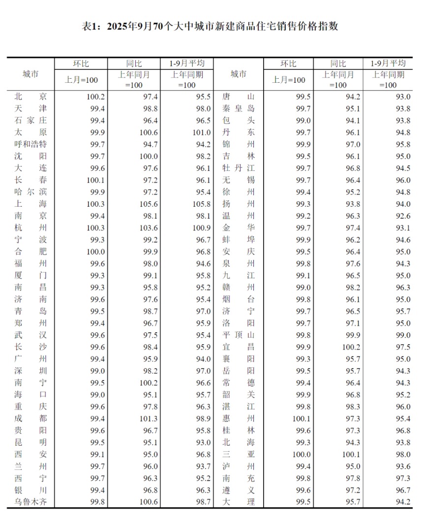 2025年9月份,70个大中城市中,各线城市商品住宅销售价格环比下降,同比降幅继续呈收窄态势。