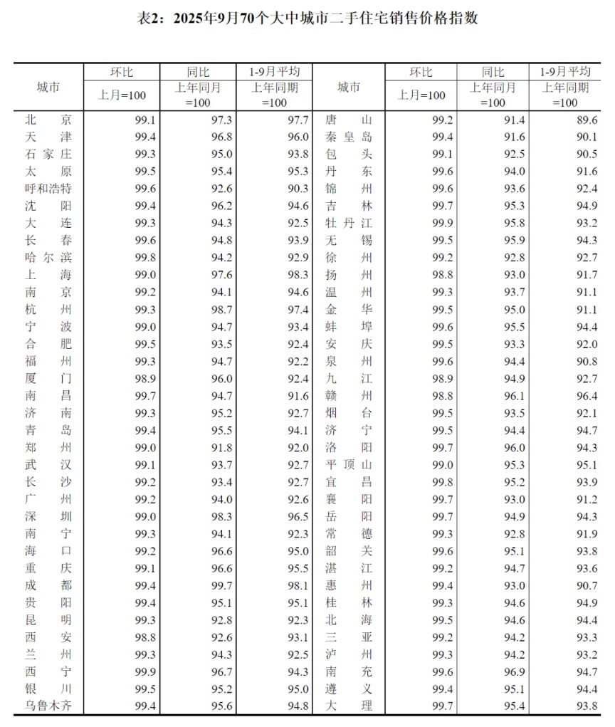 2025年9月份70个大中城市商品住宅销售价格变动情况