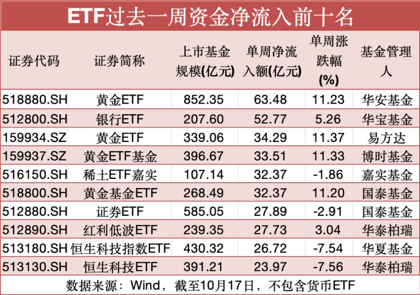 伴随着近期市场风格切换,黄金ETF、银行ETF等避险资产受到市场青睐,多只产品资金净流入居前。