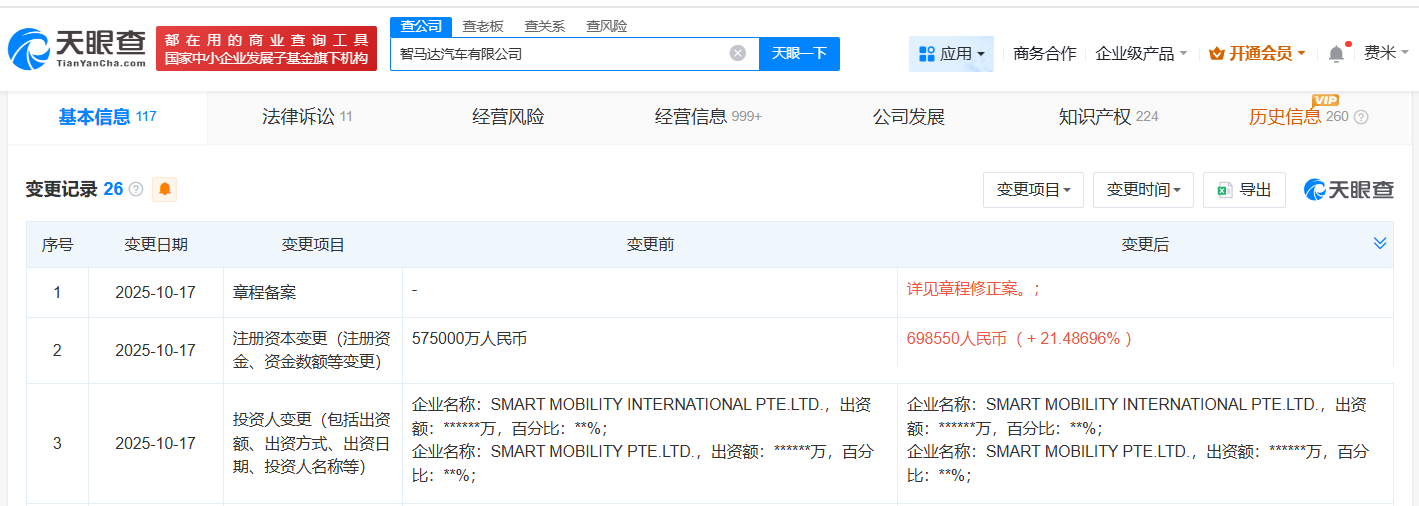 南方财经10月20日电,天眼查App显示,近日,智马达汽车有限公司发生工商变更,注册资本由57.5亿人民币增至约69.9亿人民币,增幅约21%。该公司成立于2019年12月,法定代表人为佟湘北,经营范围包括新能源汽车整车销售、二手车经销、汽车零配件零售等,由SMARTMOBILITYPTE.LTD.等共同持股。