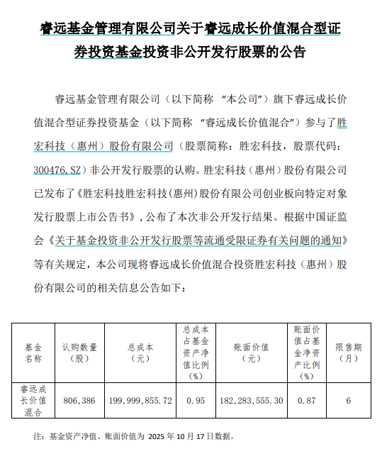 10月20日,睿远基金发布公告称,睿远成长价值混合参与了胜宏科技非公开发行股票的认购,认购股数80.64万股,认购成本约为2亿元,截至10月17日,认购成本占基金资产净值的比例为0.95%。由此估算,睿远成长价值混合的最新规模约为210.53亿元。