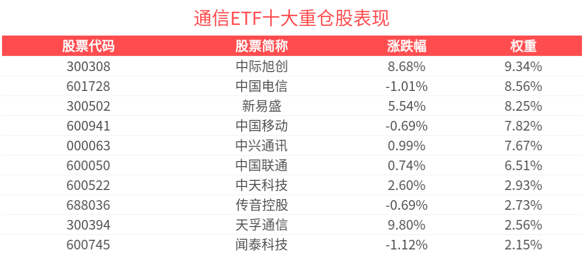 数据显示,截至2025年9月30日,国证通信指数前十大权重股分别为中际旭创、新易盛、中兴通讯、中国电信、中国移动、中国联通、天孚通信、中天科技、传音控股、亨通光电,前十大权重股合计占比66.02%。