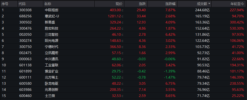 个股方面,中际旭创244.68亿元居首,寒武纪-U、新易盛、胜宏科技等成交额靠前。