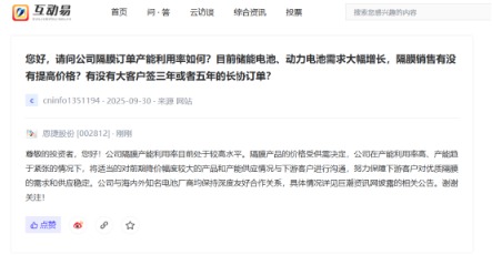 恩捷股份:隔膜产能利用率目前处于较高水平
